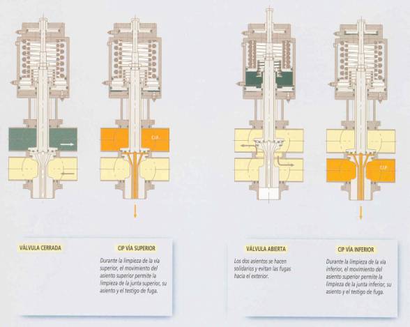 Uno de los elementos que pueden emplearse para separar circuitos que contienen producto y soluciones de limpieza son las válvulas de doble asiendo. Estas válvulas disponen generalmente de tres actuadores independientes, aunque en ocasiones es posible emplear válvulas de un solo actuador (válvulas de doble cierre)