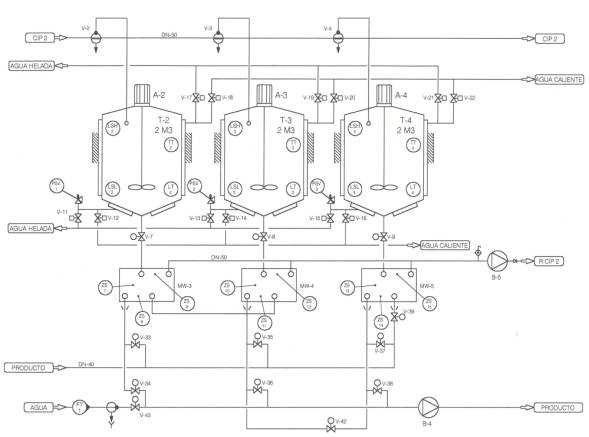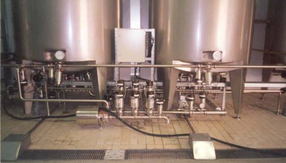 En la foto puede verse un manifold de válvulas de doble asiento que separa los circuitos de retorno de limpieza de los tanques del de alimentación de productos. Además la recirculación de producto retorna a los depósitos a través de una válvula de doble asiento de fondo de tanque (justo bajo los termómetros en la foto) lo que permite limpiar las tuberías hasta la misma pared del depósito con seguridad para el producto. También el llenado y vaciado de los depósitos se realiza a través de una válvula de doble asiendo de fondo de tanque. Además los circuitos están diseñados para que se drenen quedando totalmente vacíos al finalizar la limpieza.