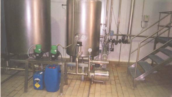 En la unidad de limpieza de la foto, se dosifican automáticamente el detergente y el esterilizante desde las garrafas de concentrado.